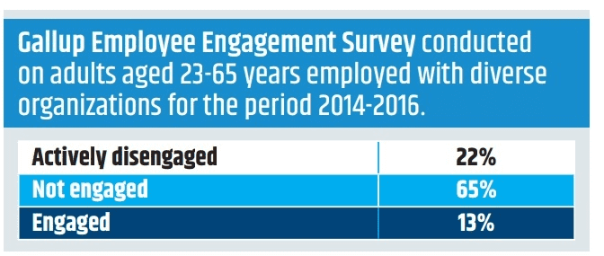 2- Another challenge for Indian HR is that as per India Gallup World Poll results based on employee engagement surveys, conducted on adults aged 23-65 years employed with diverse organizations for the period 2014-2016, only 13% of the employed workforce in India is engaged, 65% is not engaged and disturbingly a high proportion, viz. 22% are actively disengaged.