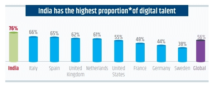 3- As per the Capgemini and LinkedIn survey around 2017, India had the highest proportion of digital talent (at 76 percent) compared to the global average of 56 percent for the countries in their survey basket.
