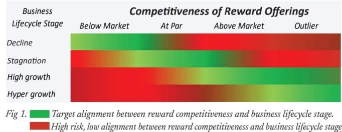 The figure below shows a model linking the business lifecycle stage and the competitiveness of reward offerings. An organization experiencing hypergrowth can have a market-leading set of reward offerings to attract and retain talent that keeps the momentum strong.