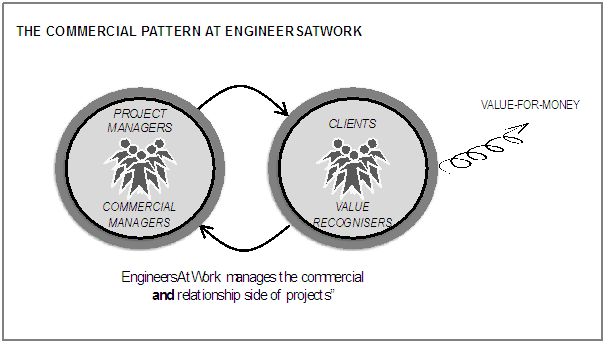 I responded, “No, you will need to reframe their role from ‘relationship managers’ to ‘commercial managers’. Changing the mental map that the project managers hold about their role will be critical to success in bringing about a financial turnaround.”I drew the new pattern that Tom would need to create at EngineersAtWork (below) where project managers would step into their role to manage the commercial aspects of the projects and ensure that clients were happy.