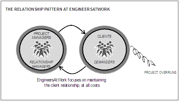 I drew the big pattern that was running EngineersAtWork on Tom’s whiteboard (below) and added, “Your project managers are behaving as if they are still operating in boom times and in a ‘soft contract’ world. Instead of charging for all the work they do, they see their role as ‘relationship managers’ who must make the customer happy, at any costs”. Of course, the project managers who had worked in the firm for years had co-created the pattern and had fought to keep it in place. Changing it would cause too much angst.