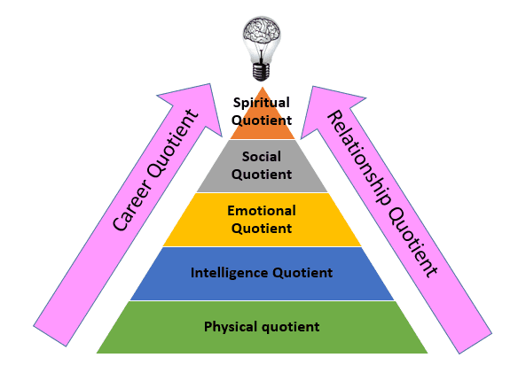 Physical Quotient is the basic one and appears at the bottom of the pyramid. Good physical health brings resilience and confidence to face anything. It is also essential in every profession and has to be maintained at an optimal level to move to the next levels.