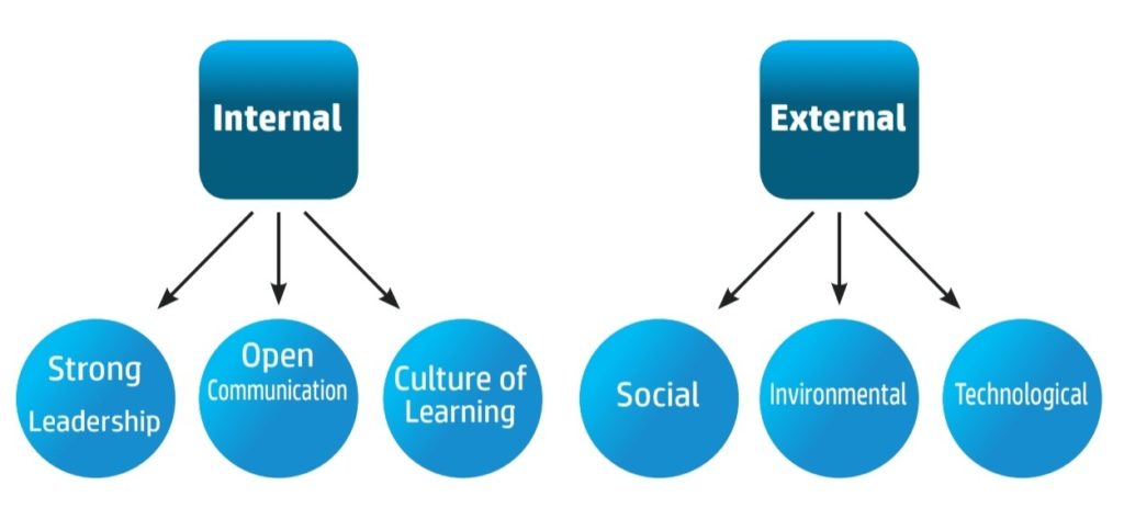 The most important internal factor is usually building a culture of learning that fosters innovation with a focus on performance efficiency. If employees are not given an opportunity to learn and grow they will soon move into another organization that provides that.