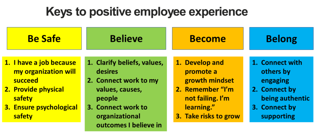 | Experience (user (employee) experience, particularly with technology; flexibility; employee life cycle) | Working to create personalized, authentic experiences from the sum of everything related to the employee at work |
