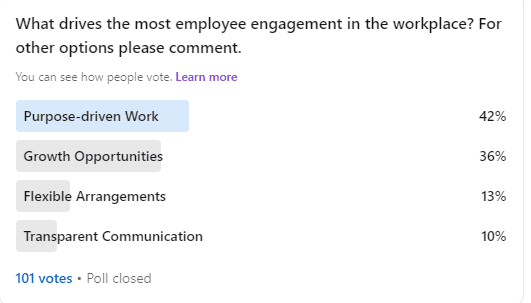 However, all these 4 factors are pivotal in boosting employee engagement, we surveyed to dove deep into what drives the most employee engagement in the workplace. The results are amazing (screenshot attached below)